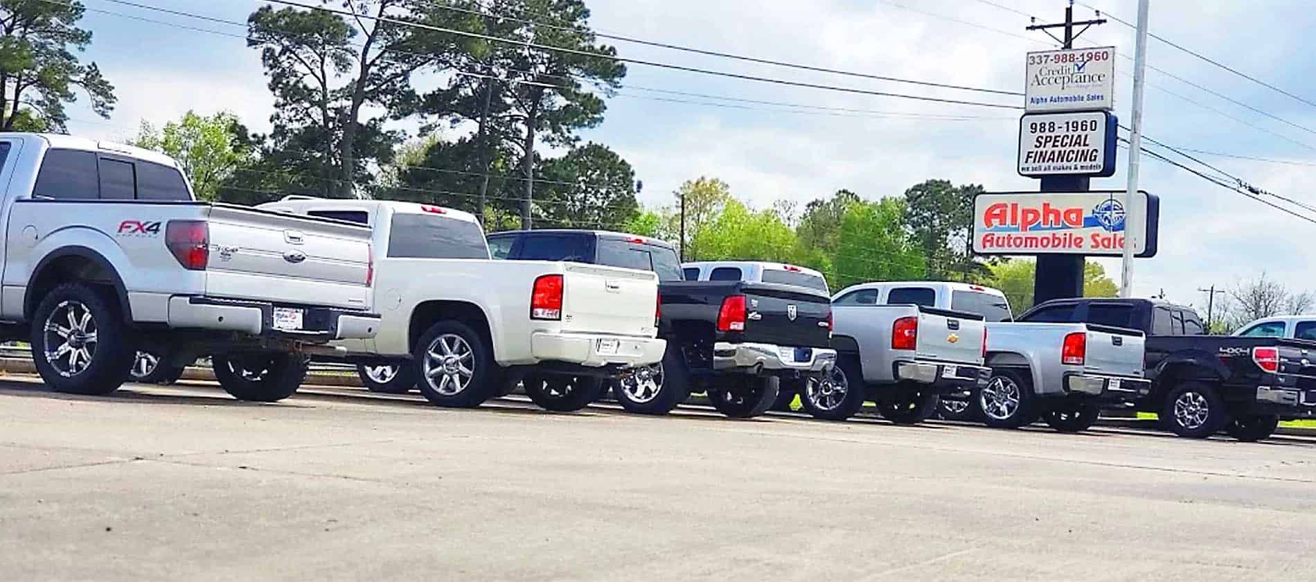 Alpha Automobile Sales is a used car and used trucks dealership in Lafayette, Louisiana. We carry a great selection of pre-owned cars for sale as well as affordable used trucks, vans, and SUV's. Bad credit or no credit is no problem! Looking for a buy here pay here dealer because the guys at Giles or Rabeaux's Auto Sales have told you 'no'? At ALPHA we say YES! We specialize in Bad Credit Auto Loans and can get you approved with in-house financing for the used car or truck that you deserve. Our friendly used car and truck staff will help you find a pre-owned car, truck, or pickup truck that fits your style and fits your budget. Alpha Automobile Sales is located at 6904 Johnston Street, Lafayette, LA 70503. Ask us about our used trucks and pickup trucks.